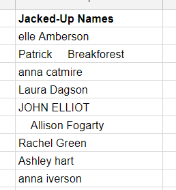 - You have a column of names, but they don't have consistent capitalization or number of spaces between first and last names:
