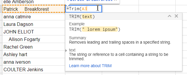 See what happens when you apply the TRIM function to a column of names with inconsistent spacing. Best of all, TRIM will also remove hidden spaces AFTER words, which are invisible to the naked eye, but will skrillex your PivotTables and Filters.